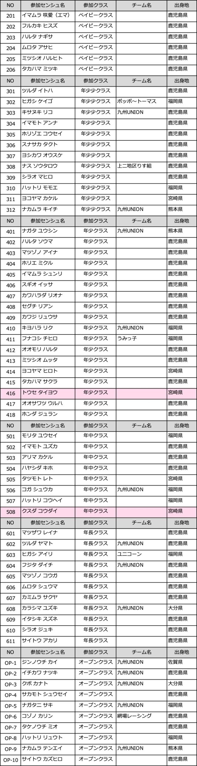 また「入金しているのにピンク色」の選手は、お振込日と振込者名(カタカナ)を事務局までお知らせくださいませ。