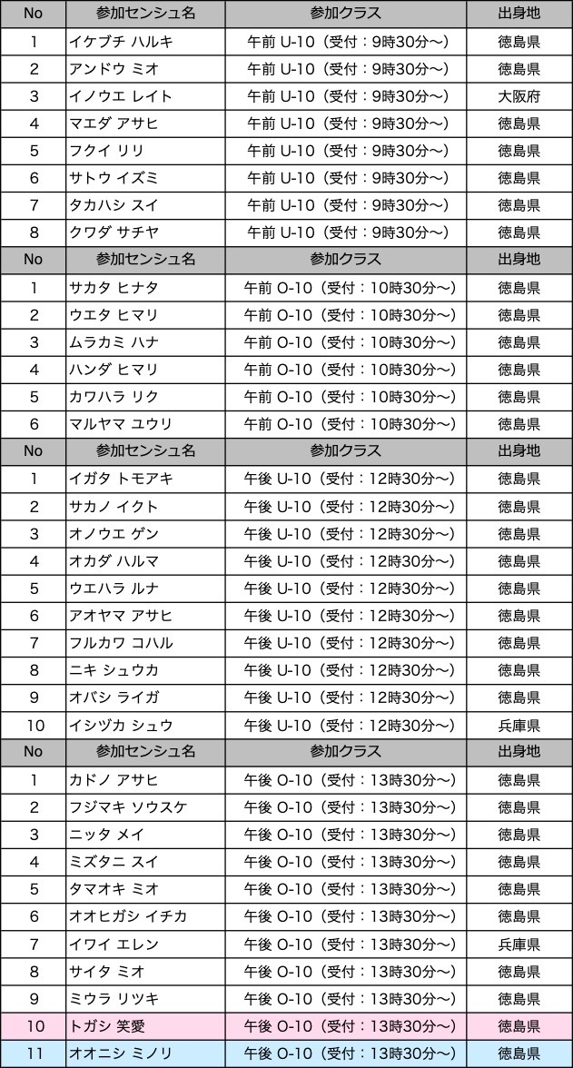 10/2(木) 午前11時 時点でのエントリーリストになります。ピンク色は未入金の方、水色は直前受付の方です。
