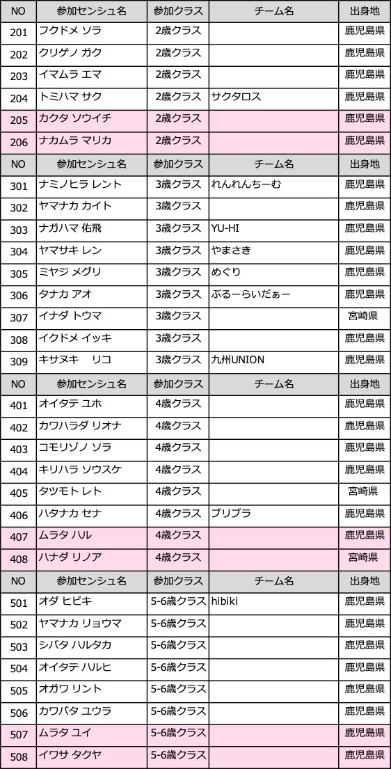 また「入金しているのにピンク色」の選手は、お振込日と振込者名(カタカナ)を事務局までお知らせくださいませ。