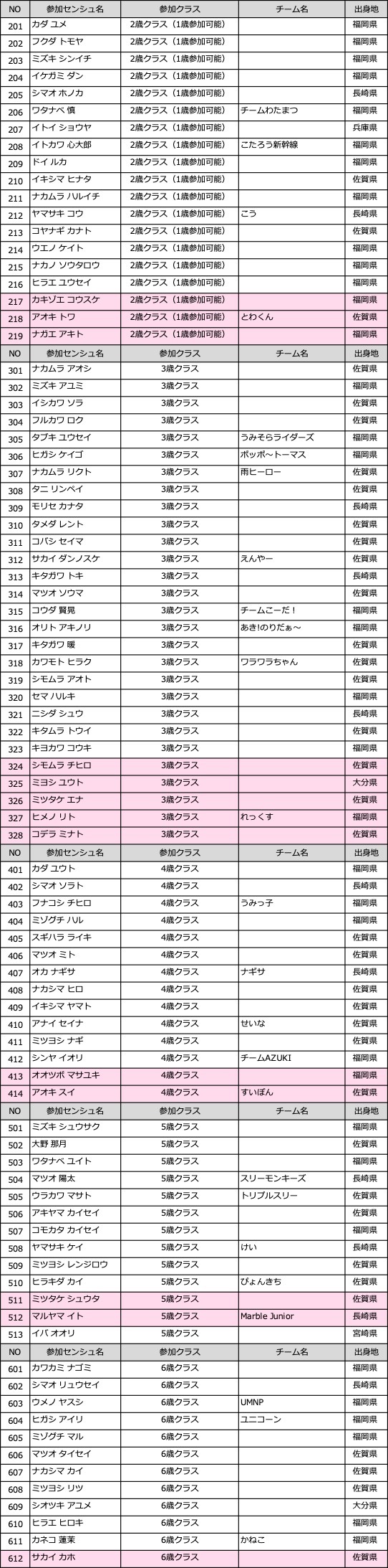 また「入金しているのにピンク色」の選手は、お振込日と振込者名(カタカナ)を事務局までお知らせくださいませ。