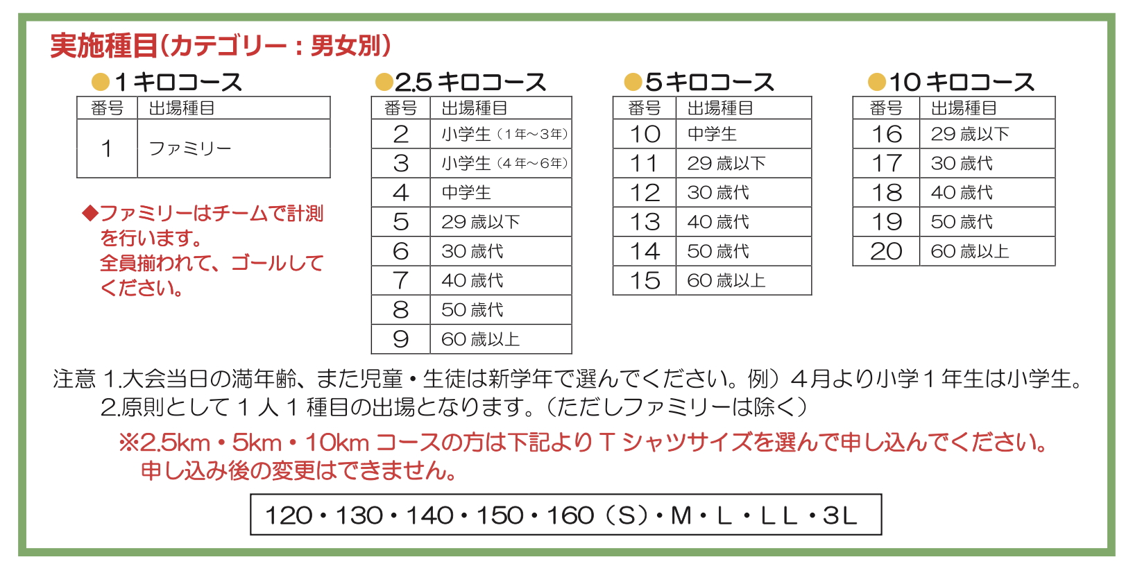 ファミリー、2.5km、5km、10kmコース